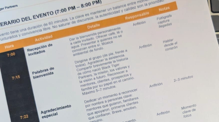 Jesús agradeció a su familia y a todos los que estuvieron presentes. Habló de su entusiasmo por el futuro. Yo agradecí a cada mentor, a cada persona que en algún momento nos dijo "sí" o nos dio un consejo que nos hizo avanzar. Y en ese círculo de 20 personas, en un cuarto piso con vista a la ciudad, entendimos que Black Tiger Partners ya no era solo nuestro — era de todos los que habían caminado con nosotros.